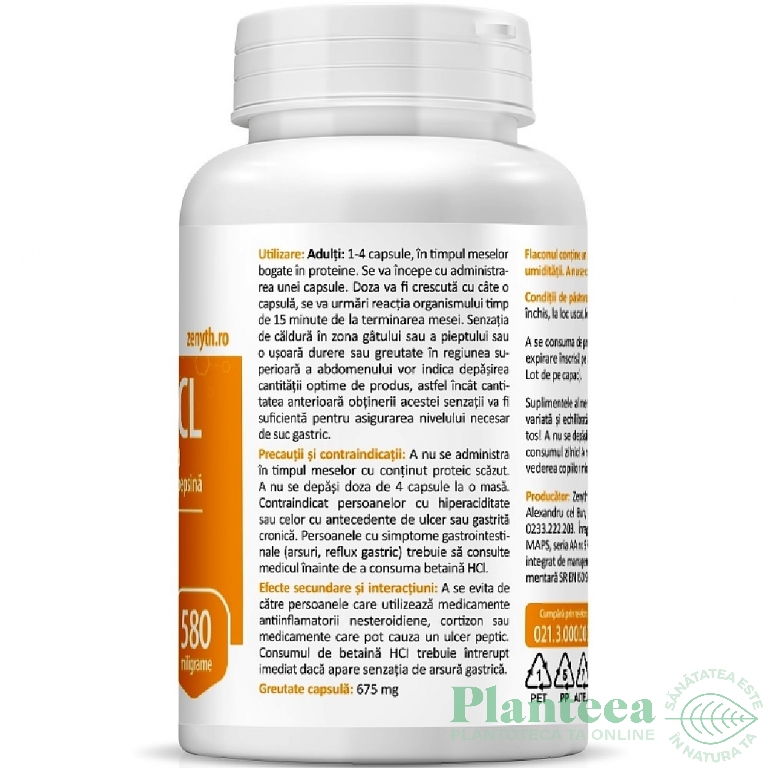 Specificatii Betaine HCL pepsin 580mg 60cps - ZENYTH