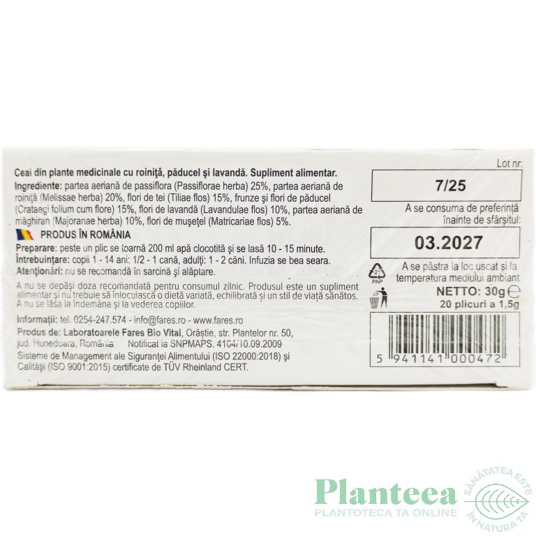 Specificatii Ceai natural Somn linistit 20dz - FARES