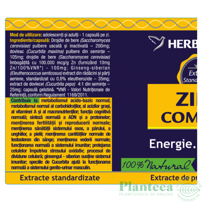 Specificatii Pachet Zinc complex 60+10cps - HERBAGETICA